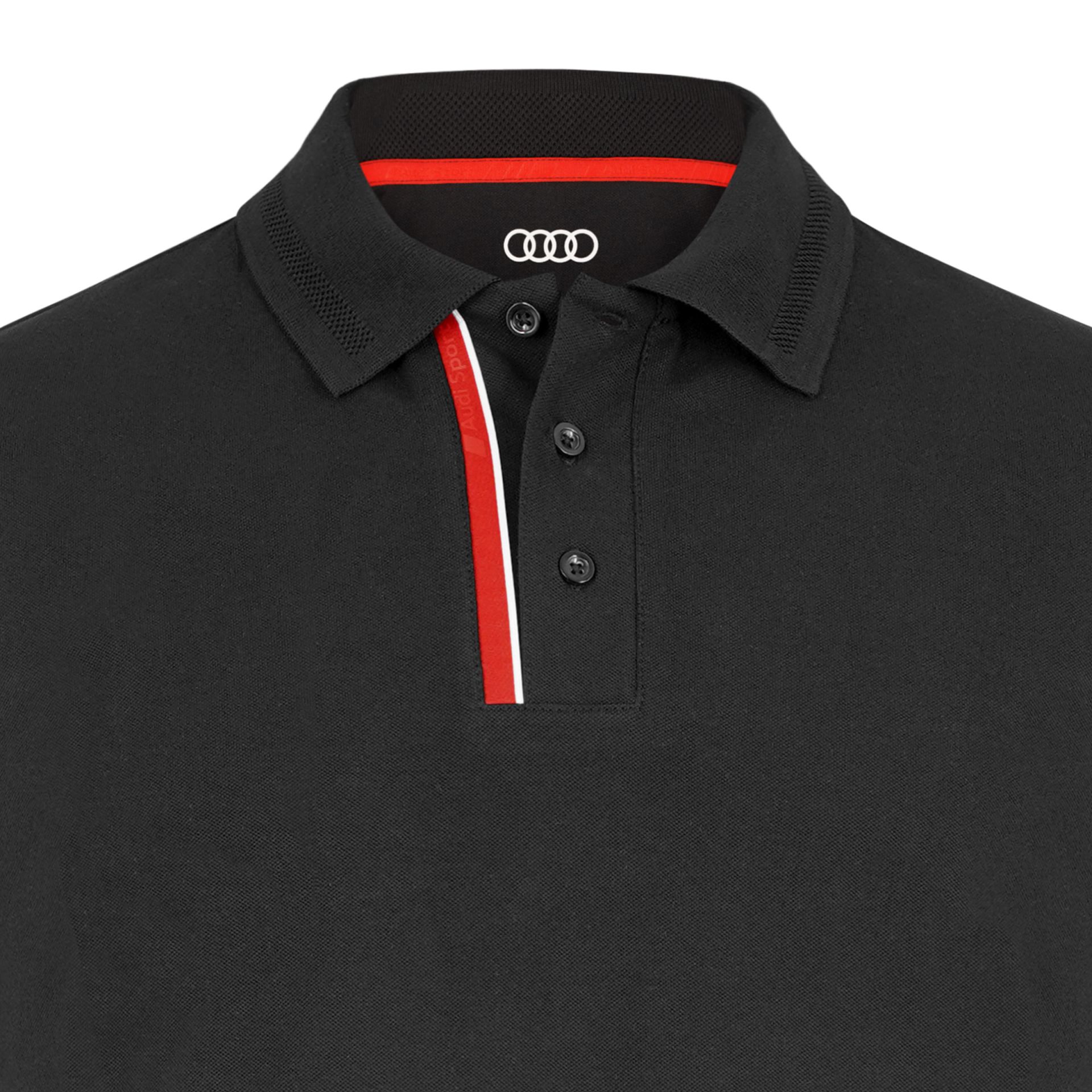 - Audi Ringe auf dem Nackenlabel innen und Audi Sport Logo auf dem Kontraststreifen neben der Knopfleiste