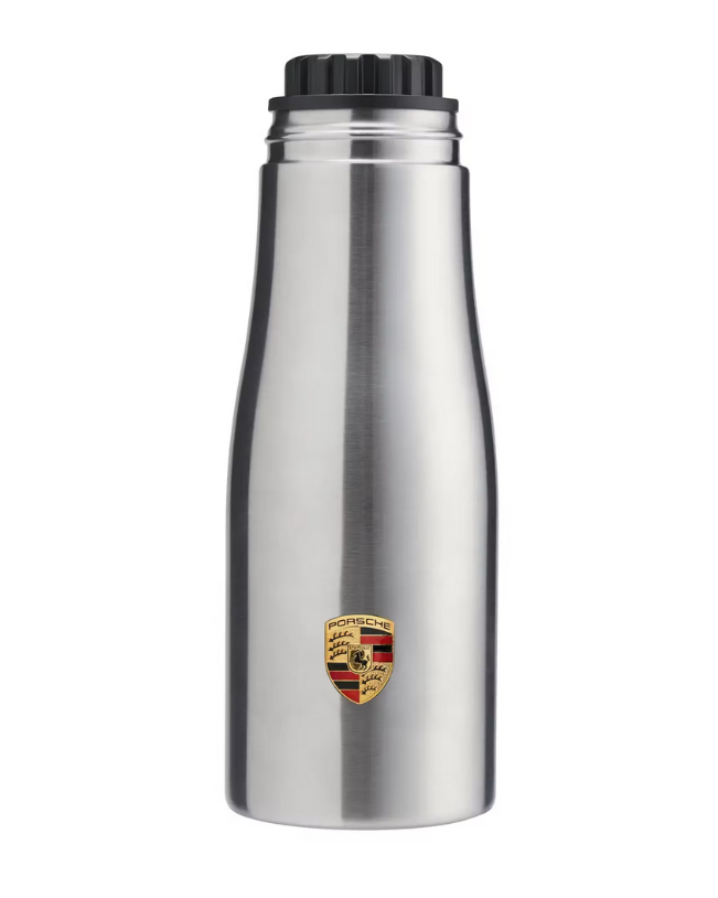 Aus doppelwandigem Edelstahl. Mit Porsche Wappen auf dem Korpus und Verschluss in Anlehnung an den Porsche Zentralverschluss.