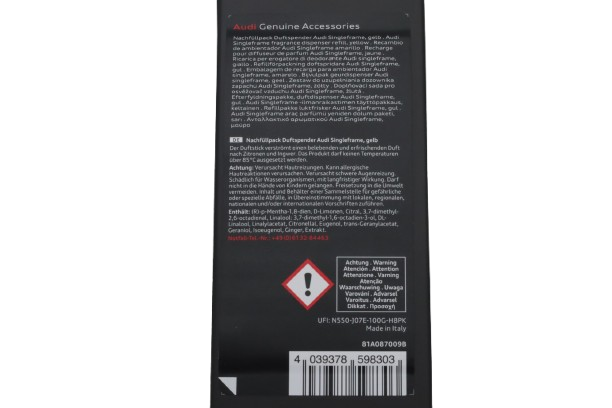 Erfrischen Sie Ihr Fahrerlebnis mit dem praktischen Set aus einem Audi Nachfüllpack für Duftspender und einem Reinigungstuch für Touchdisplays. Das Nachfüllpack sorgt für langanhaltenden, angenehmen Duft in Ihrem Fahrzeug, während das Reinigungstuch für streifenfreie Sauberkeit Ihrer Touchdisplays sorgt. Ideal für Audi Besitzer, die sowohl für frischen Duft als auch für klare Displays sorgen möchten. Perfekt für den gepflegten Innenraum Ihres Audis.