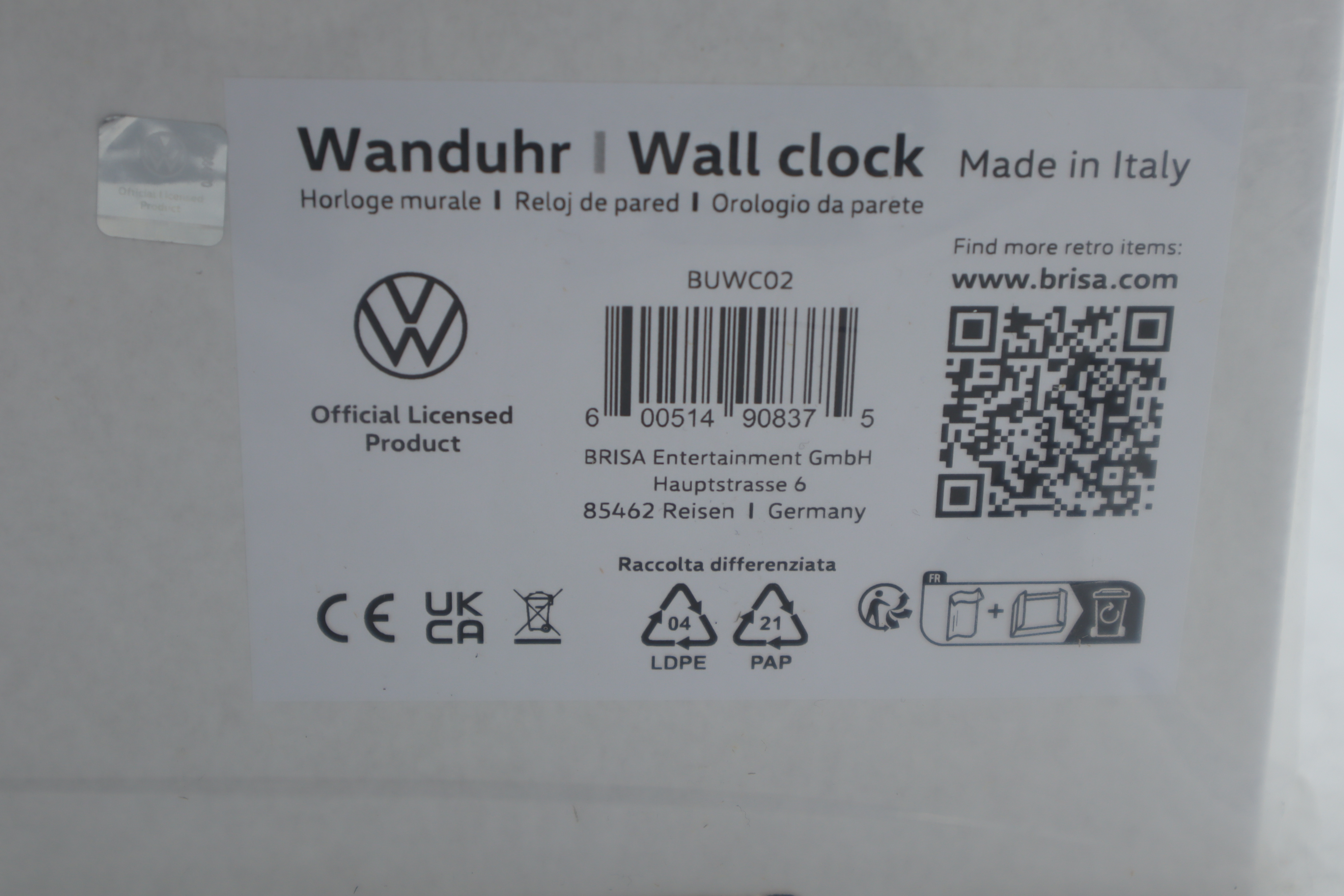 Die offiziell lizenzierte Volkswagen T1 Wanduhr von BRISA sticht durch ihre hochwertige Verarbeitung und dem tollen Design heraus. Der auf der MDF Platte abgebildete Bus ist garantiert ein Hingucker an jeder Wand. Ein batteriebetriebenes Uhrwerk sorgt für die korrekte Zeitangabe. Der Zeitmesser in 3D Optik wird mit einer AA-Batterie betrieben. Im Lieferumfang sind Batterien nicht enthalten. Durch ein angebrachtes Loch in der Aufhängung ist die Uhr problemlos an der Wand abhängbar. Die VW T1 Uhr wird in einem weißen Karton mit Sichtfenster geliefert. Mit diesem Nostalgie-Look kommen Sie immer pünktlich zum nächsten "Bulli" Bus/Campervan Festival!